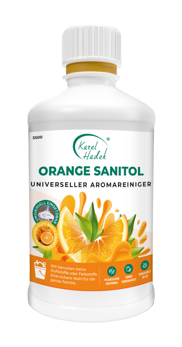 Teppiche : ORANGE-SANITOL kann in einer Konzentration von 1 % (ein Esslöffel pro 1 Liter Wasser) verwendet werden, um verschiedene Teppichflecken zu entfernen. In diesem Fall funktioniert eine alte Plastikflasche mit einem Zerstäuber. Wir empfehlen, den Fleck einzusprühen und mit einem Schaumschwamm zu schrubben. Zur Sicherheit empfehlen wir, an einer unauffälligen Stelle zu testen, ob das Produkt die Farben des Teppichs anlöst.